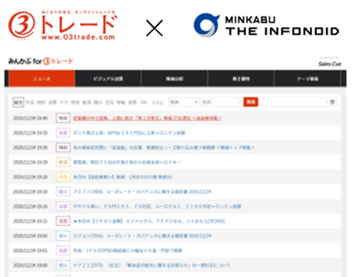 2021年1月,正式向丸三證券提供股票數(shù)據(jù) 2021年1月4日 株式會(huì)社みんかぶ與丸三證券聯(lián)手,為投資者推出了名為「MINKABU for 03trade」的服務(wù),為更多的個(gè)人投資者提供快速、準(zhǔn)確、全面的金融服務(wù)。